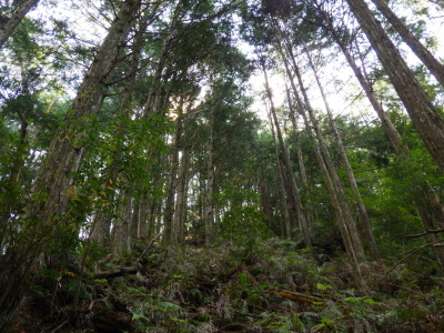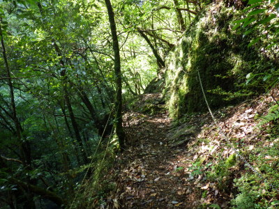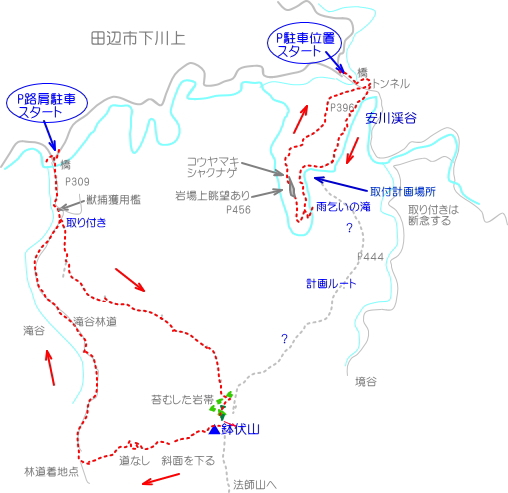安川渓谷からの鉢伏山ルートは断念したが、また別に滝谷林道側からのルートが知られている。このルートはヤマレコの地図軌跡として載っていたもので、ありがたく参考にさせていただいた。おかげで無事に山頂を踏むことができ、さらに山頂から滝谷林道へとイッキに下るルートも利用させてもらった。 |