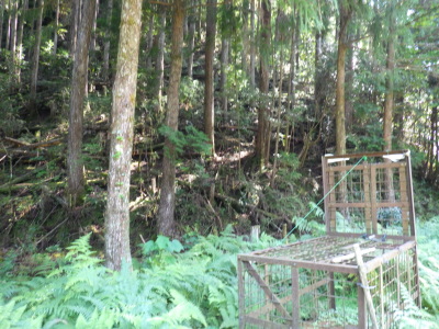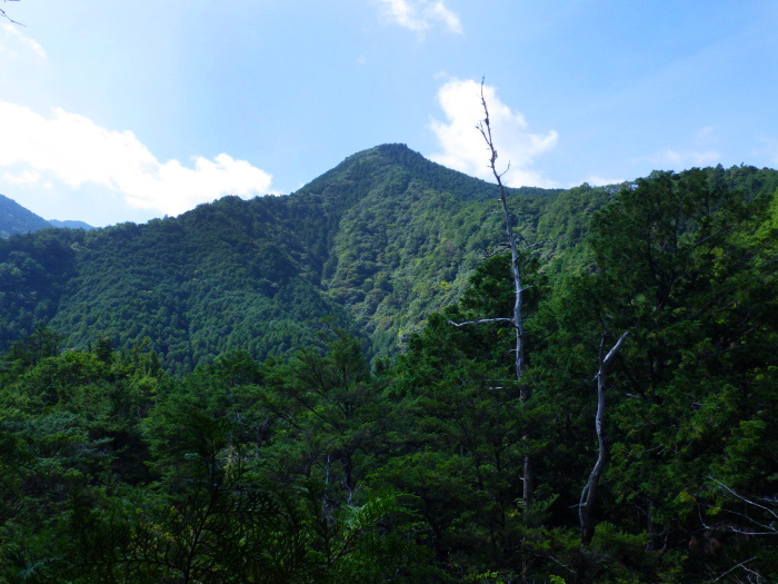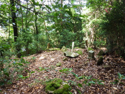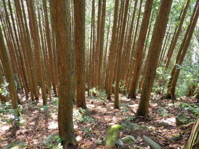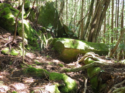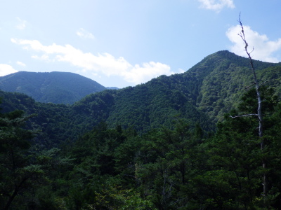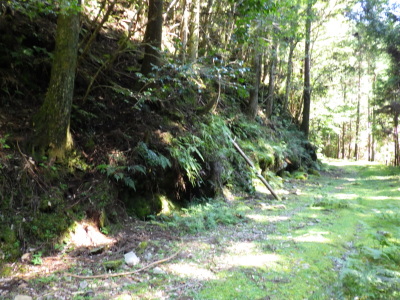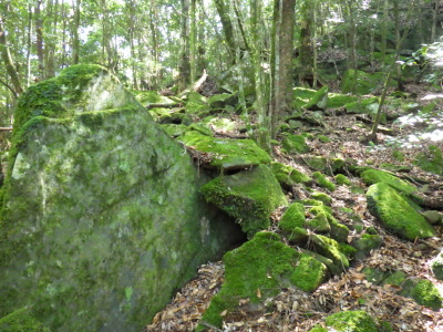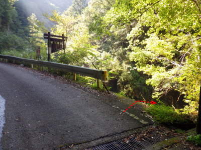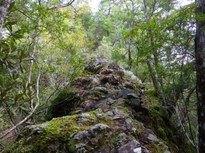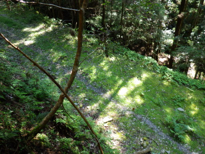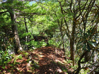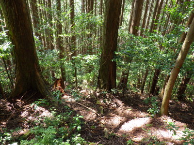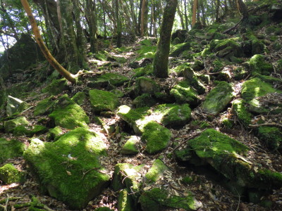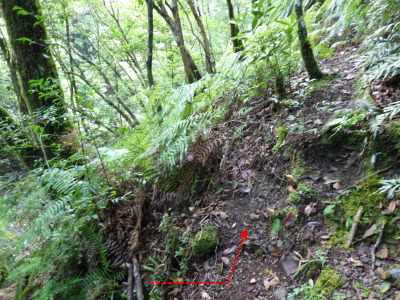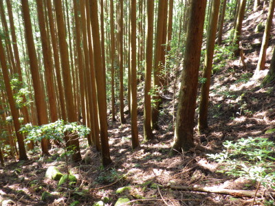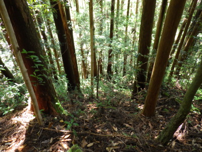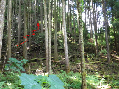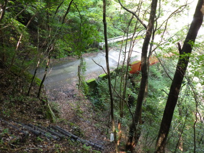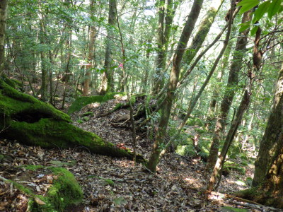 鉢伏山から滝谷林道へと直に下るのだが、林道手前の法面で下りられないこともよくあることだ。ここはヤマレコの軌跡にある林道着地点へと確実に向かいたいところだ。下る斜面には岩場があったりしたので、斜面を左右にふりながら慎重に着地点に向かって下った。汗だくになった。 |