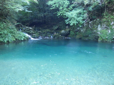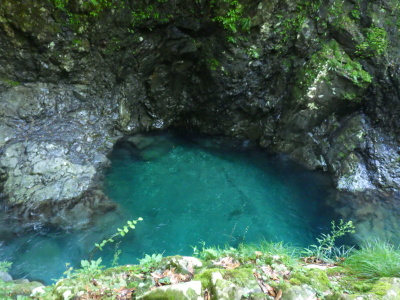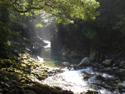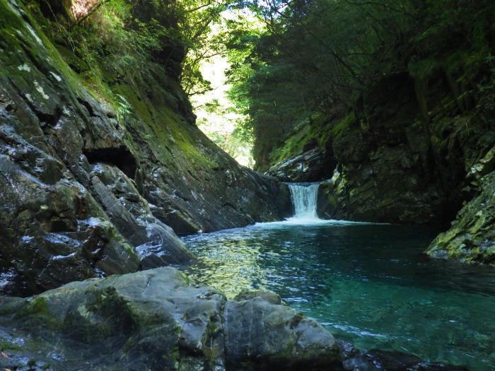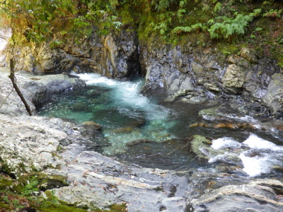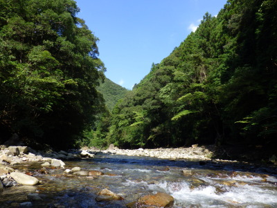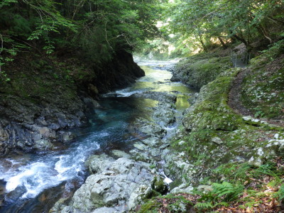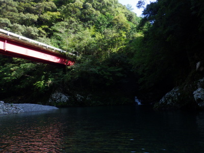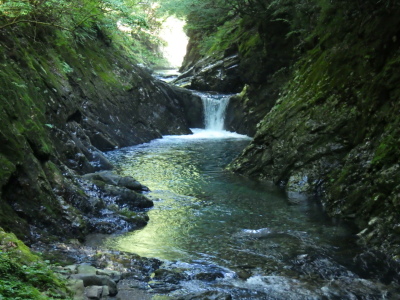 予想通り渓谷の水量は多く、簡単には徒渉できそうにない。また尾根へと上がるには、渓谷から岩の斜面を上がらないといけないが、最も傾斜が緩い地図上の位置でも、実際は結構ハードルは高く、仮に上がっても下りられないと思った。結果、自分なりに納得したので、このルートは諦めることにした。 |