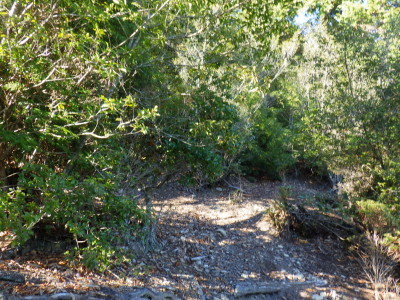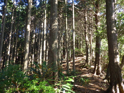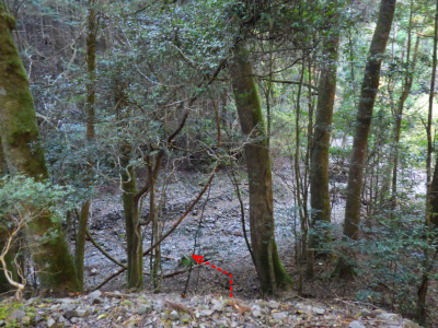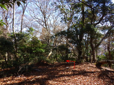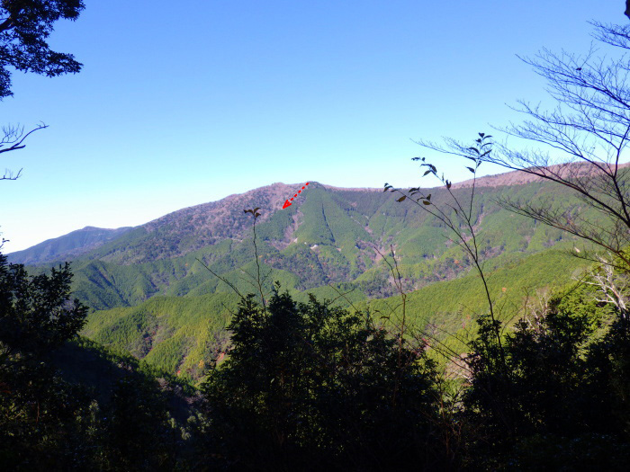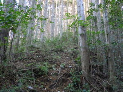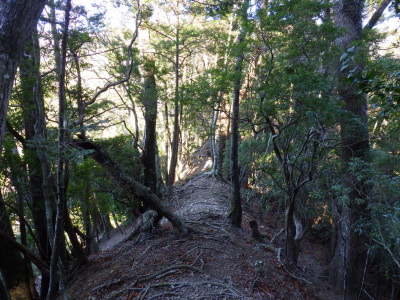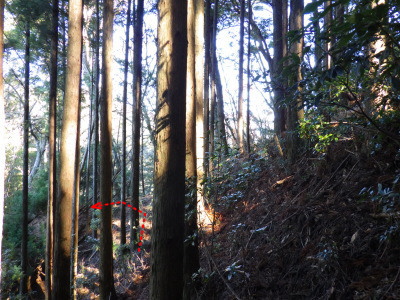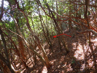 樫尾森山からの斜面から、この細い尾根道を探す |