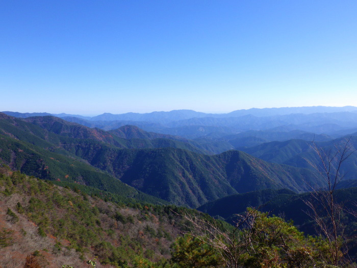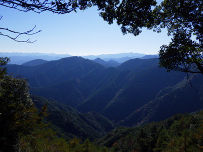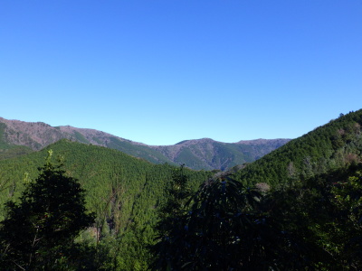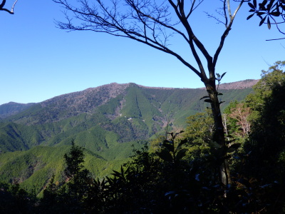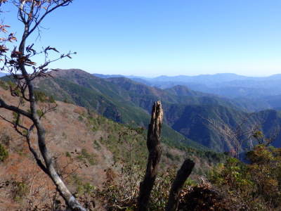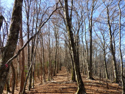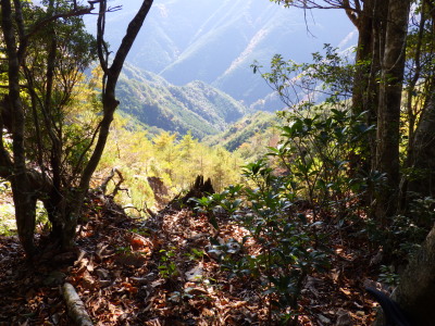 | 樫尾森山から公門の崩方面への稜線尾根へと向かうが、最初は広い斜面となっていて、何処を進むべきかが判然とせず、つい歩きやすくなっているやや左方へと下ると、右手に稜線の尾根が見えた。ルート間違いだ。ここは広い斜面から、細い痩せた稜線尾根一点へと向かわないといけなくなるので、特に注意が必要だった。 |