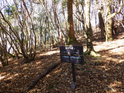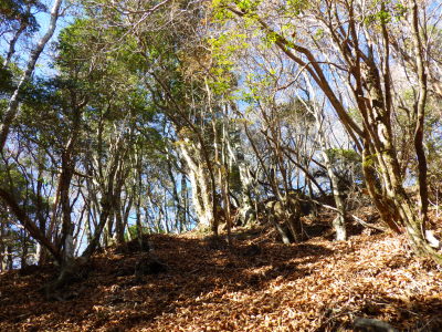 落ち葉を踏みしめ果無山脈縦走路を進む |