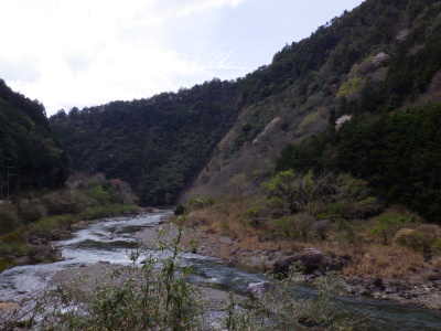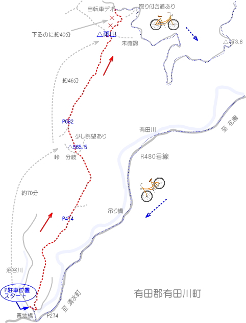 | 有田川から歩いた稜線を見る | 14:00 青地橋を渡り直ぐの沼谷川沿いの駐車位置に到着 | |
