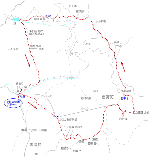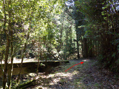 | 県道48洞川下市線(34度20分37.01秒 135度51分21.87秒) | 8:46 橋を渡り右手に踏み跡があった | |