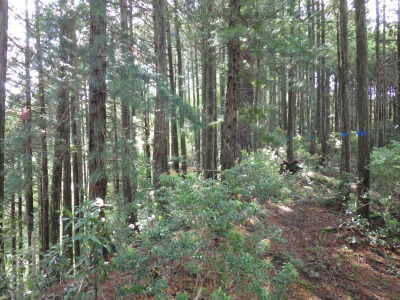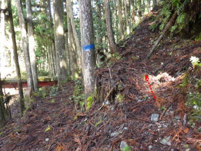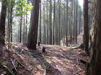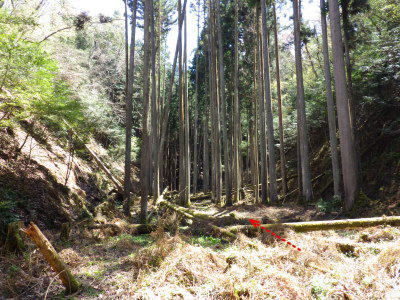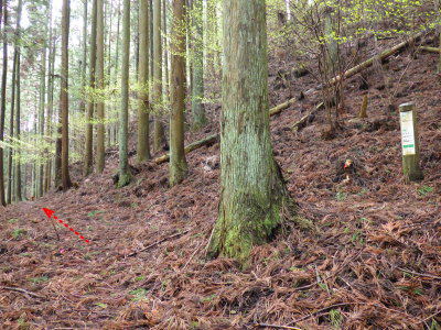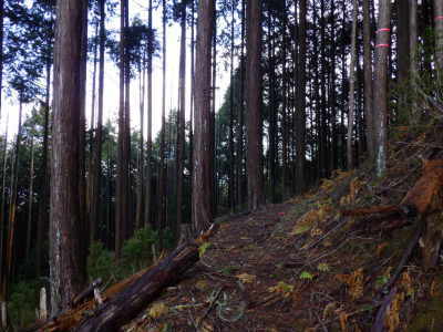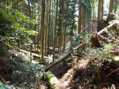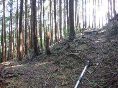| やや平坦な植林帯を進む(左手上に踏み跡あり) | 倒木が多い | |